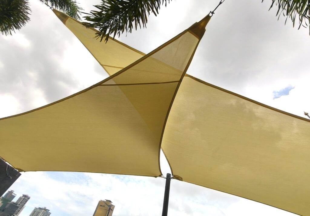 As a replacement project we realized for our client in Phnom Penh, two HDPE shade sails for his rooftop area. The sails fabric is made from high quality HDPE Monofilaments with a manufacturer warranty of 15 years! Furthermore stainless steel components & premium quality PTFE-thread are consequently used to withstand the harsh outdoor conditions & wind in Cambodia. All materials are UV-resistant & rust-proof. With high UV-reflection cloth a remarkable cooling effect of more than 5 degrees celcius is gained at the rooftop.